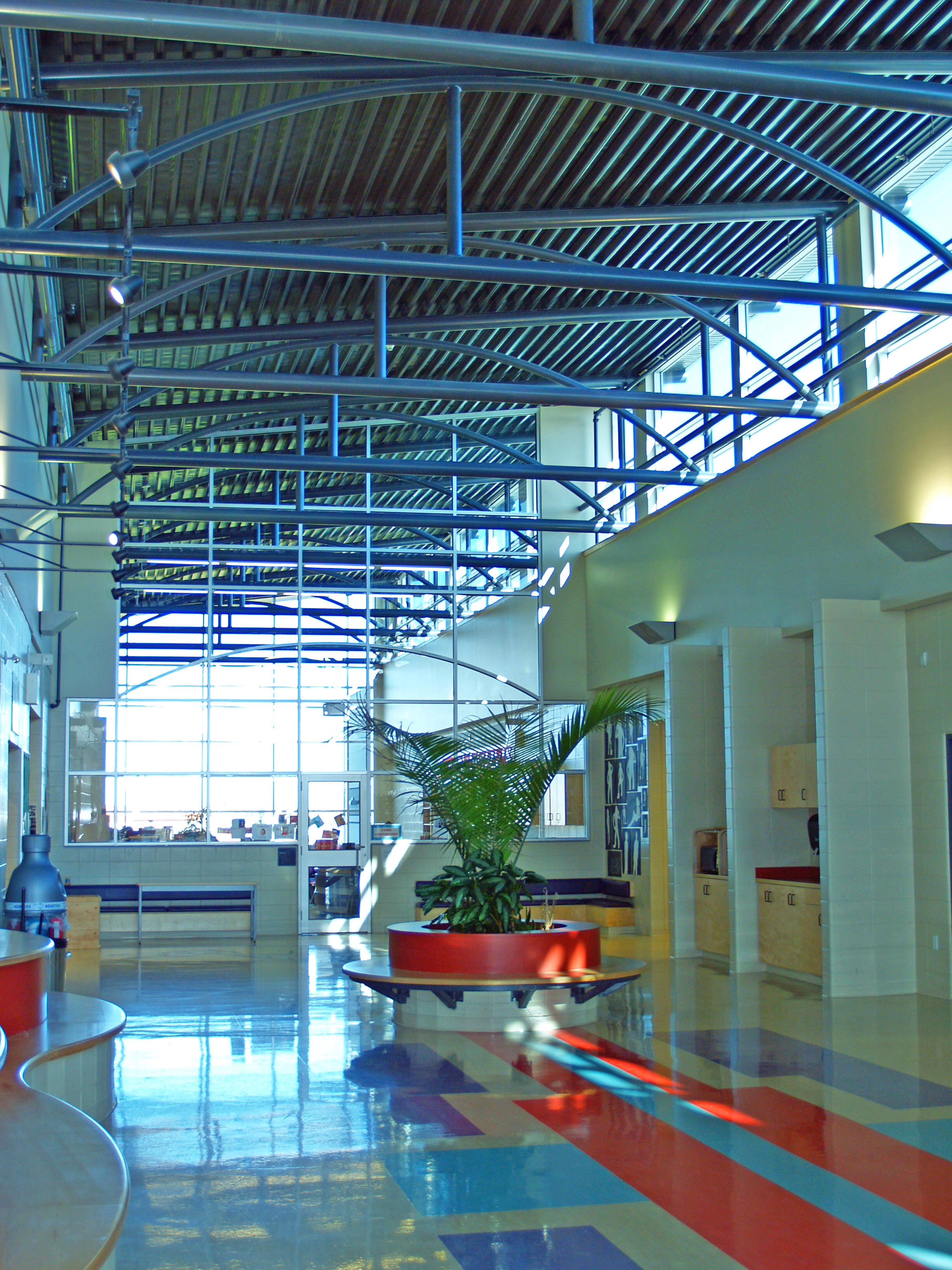 The facility has central common amenities for all divisions, including the gymnasium, library, food server and administration suite. An on-site bus layby was mandated by the City of Grande Prairie. A separate on-site parent drop / pickup zone was also created. Steps were taken to minimize potential for on-site conflicts between pedestrians, cars and buses.