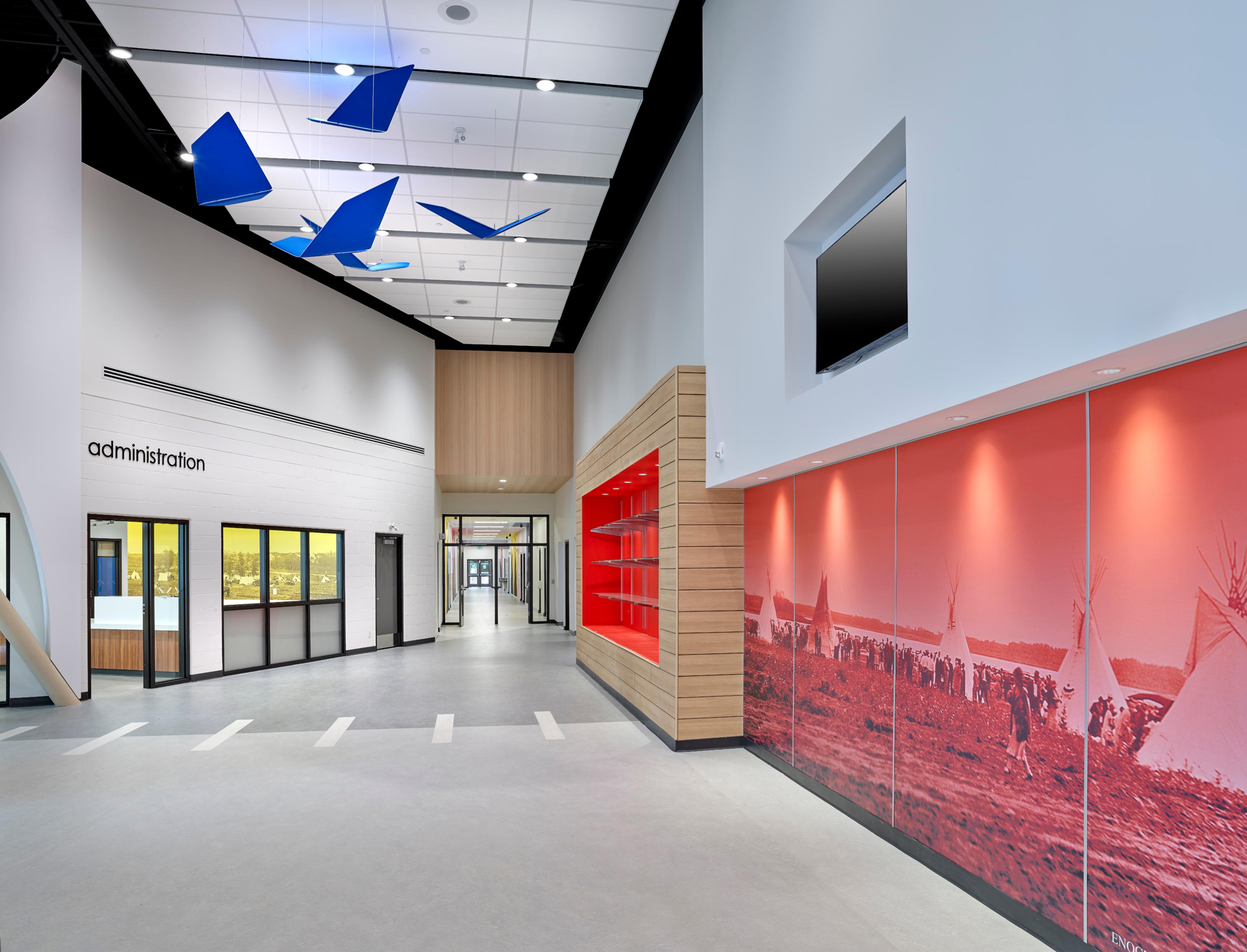 This K-12 school located in the center of the Enoch First Nation has a student capacity of 422 students. The building design represents both the modern image and traditional beliefs of the Enoch Nation, creating a functional and inspirational learning environment that ties the past to the present. School highlights include: a Preschool room, 2 Kindergarten spaces, 15 Classrooms, Learning Centre, Cultural tepee , Music Room, Foods/Cosmetology, Industrial Arts lab, Learning Common, Elders Lounge, and a 2 station Gym. The building is designed as a secondary Community Centre. Major Gathering Spaces, a Theatre Stage and Commercial Kitchen are designed to open and expand for large Community functions. The building is highlighted by an abundance of glass to allow views between spaces, and to the outside.