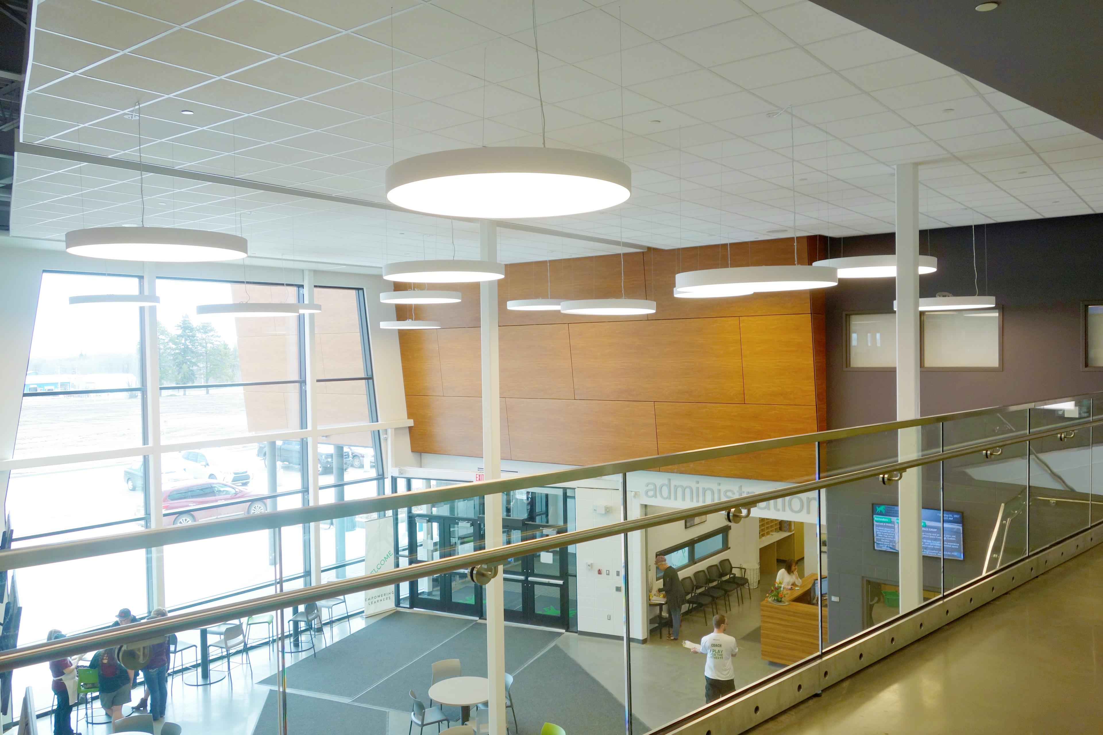 The Onoway Junior Senior High School involved the design and construction of a new replacement school facility to accommodate Grades 7-12 . The new two-storey school, designed to achieve LEED® Silver Certification, has a capacity of 750 students with a build-out capacity of 850 students with the addition of 4 modular classrooms (totaling an additional 400m2). The entire facility is a modern, bright, and inviting learning environment with a streamlined open-concept plan focusing on social interaction and accessibility with ease of circulation and supervision. Features include a massive CTS Wing, Second floor running track, fitness room, performance theater , kitchen, student work pods, & a cafe that the students run as part of their business program.
