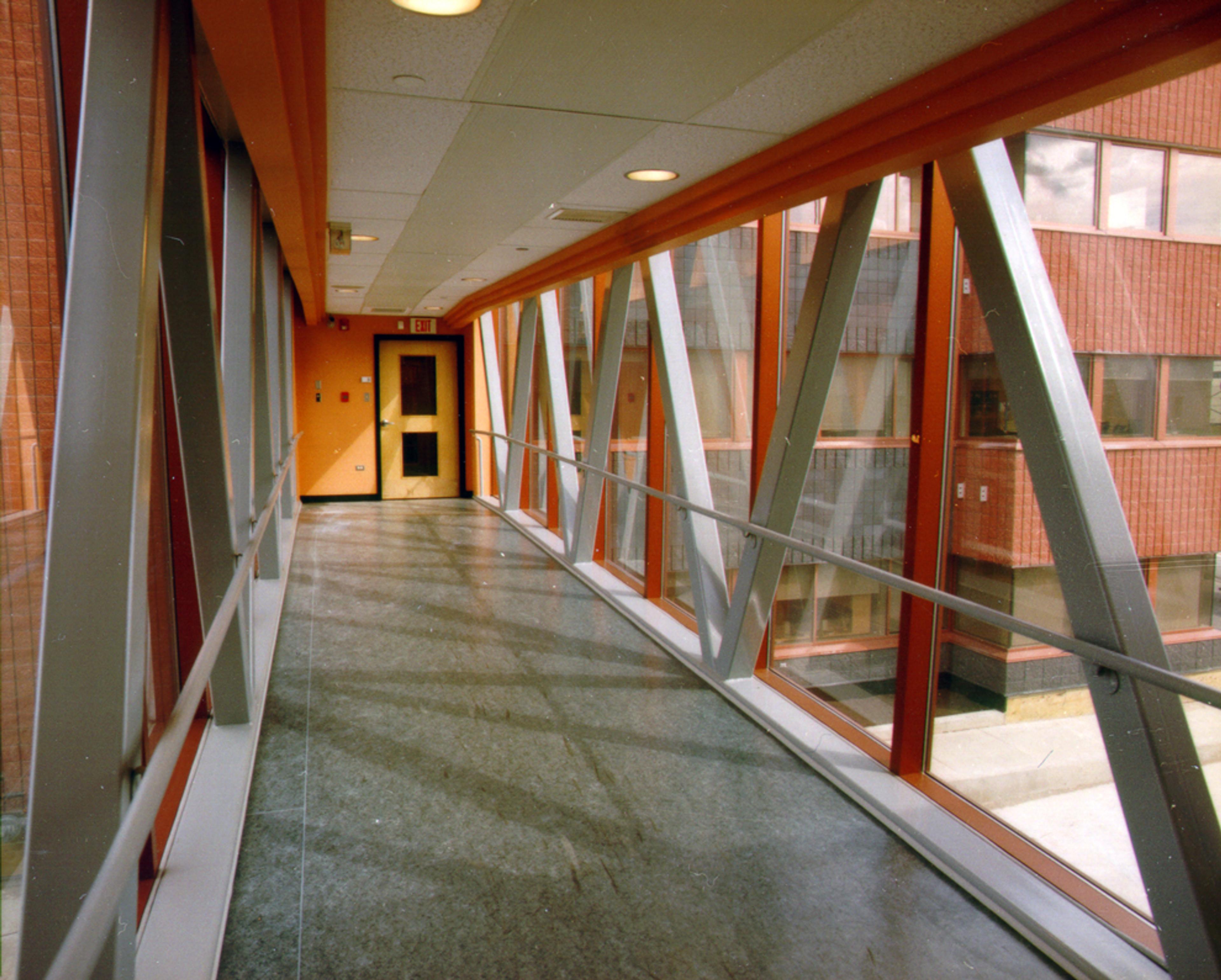 A fitness room, located on the main floor, is provided as an employee wellness centre. Other main floor amenities include an atrium and reception area, and an employee lunch room/lounge. Conference facilities are also provided at this level. The second floor houses Waiward’s engineering and drafting department. A pedway, constructed as a steel box truss, connects the new office building to the fabrication plant. The third storey consists primarily of the management and payroll offices. Conference and meeting rooms straddle and overlook the three storey atrium. A south facing outdoor sundeck has been provided on the roof, for the staff use.